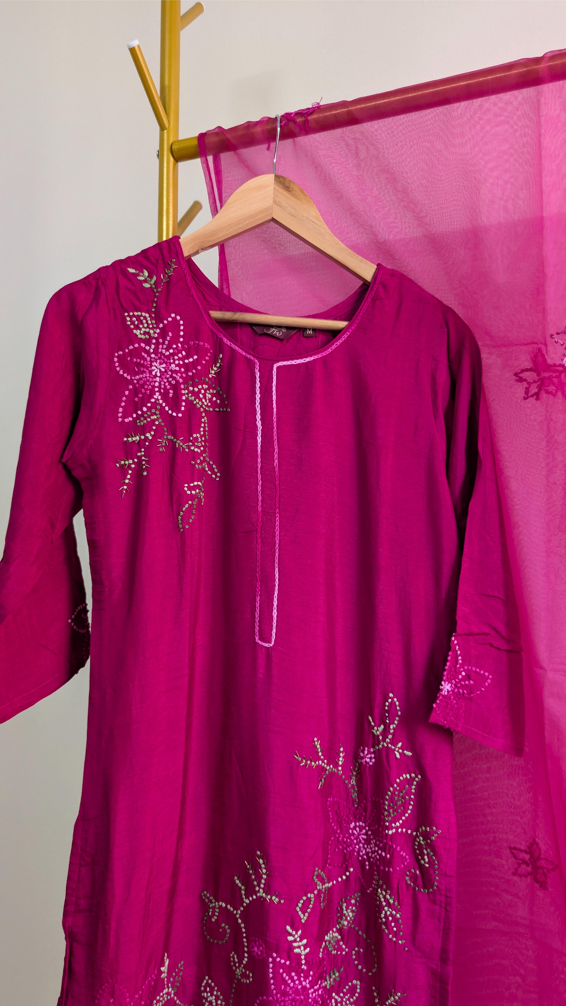 The set includes a kurta, matching bottoms, and a coordinating dupatta with embroidered touches that echo the kurta’s floral design. Lightweight, breathable, and elegant — perfect for festive wear, casual parties, or day events.