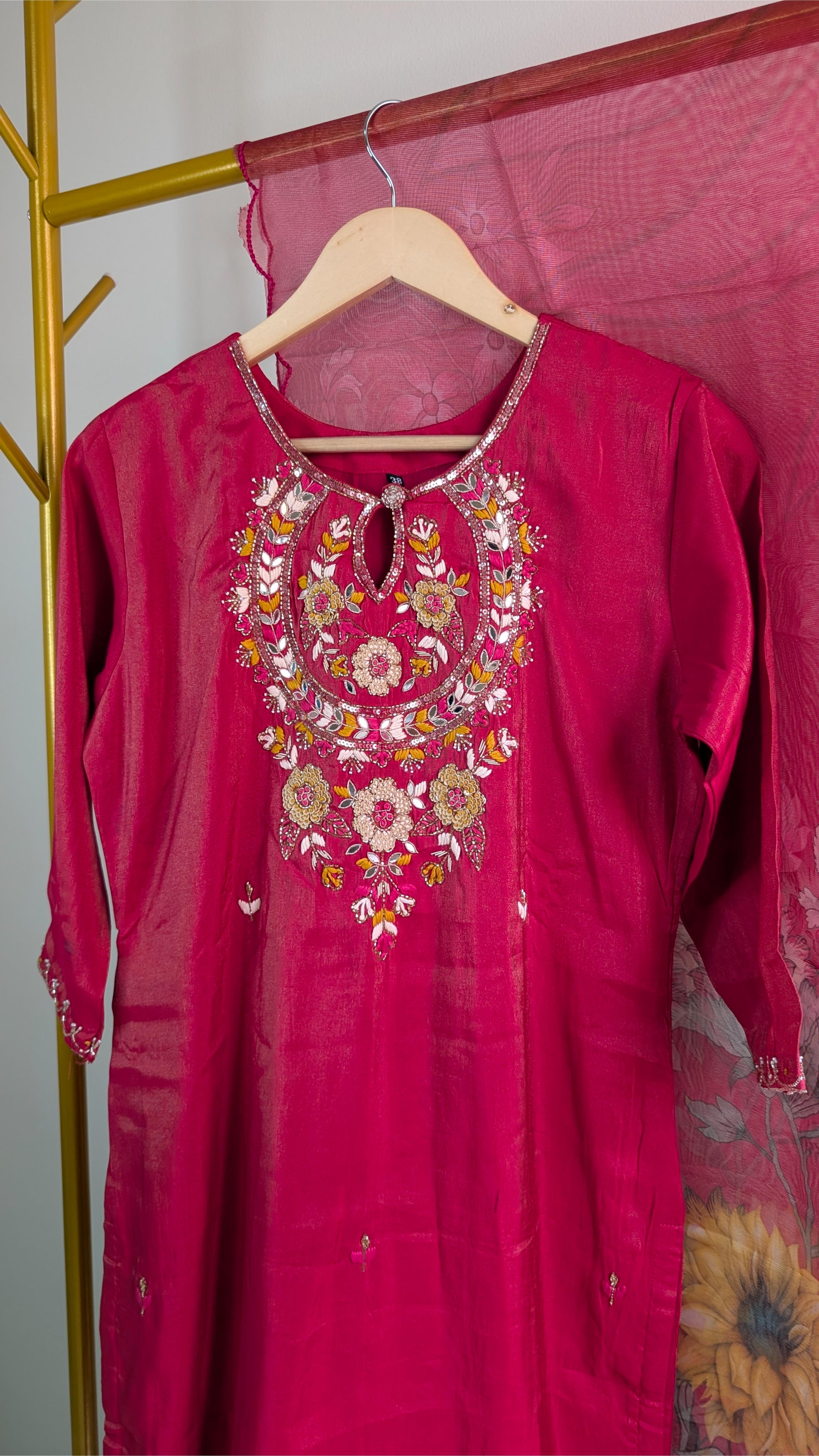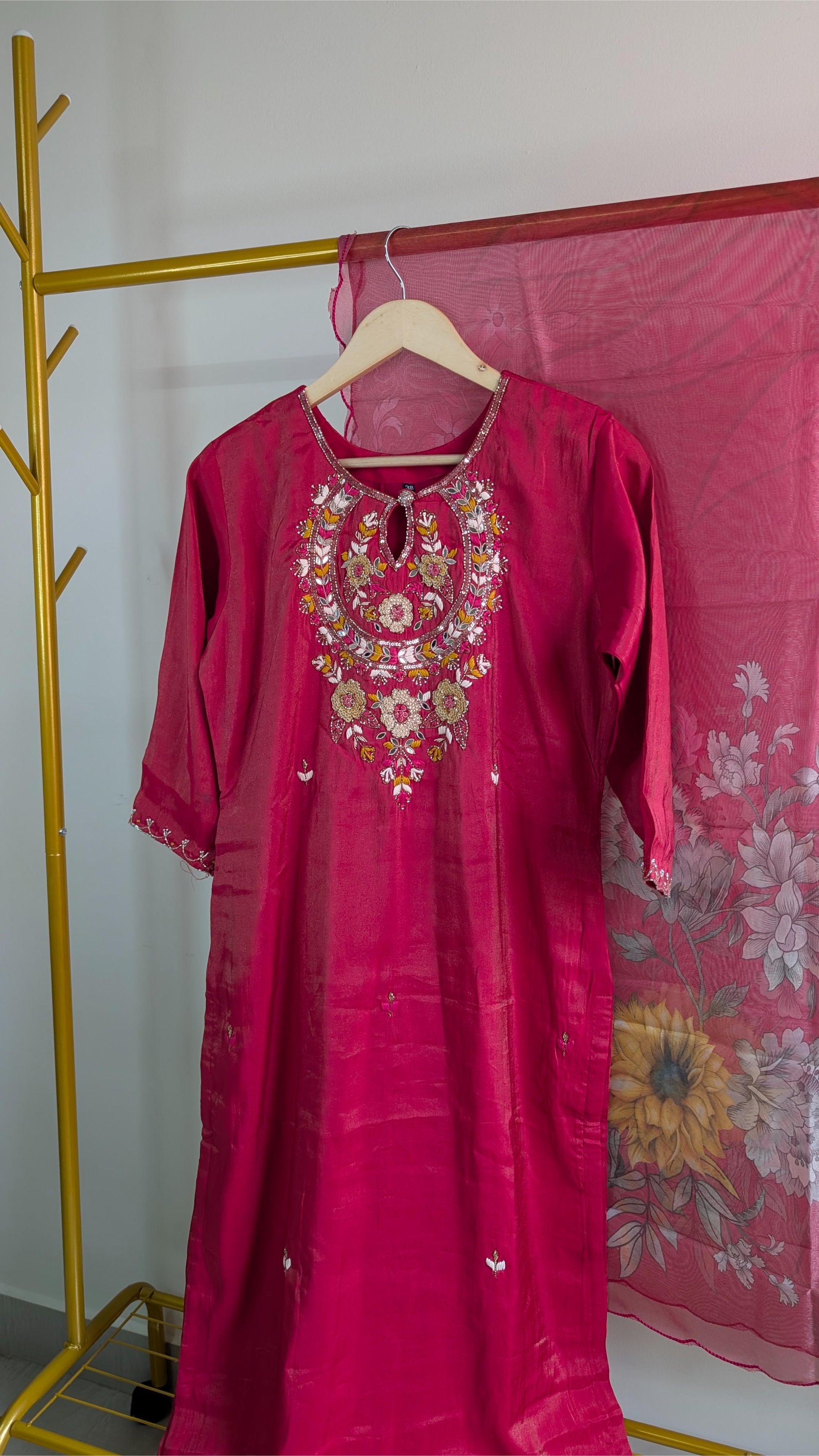 This elegant reddish pink 3-piece kurta set features exquisite floral embroidery with mirror and thread detailing on the neckline and sleeves. Crafted from a soft, lustrous fabric, it comes paired with a matching floral-printed dupatta that adds a touch of grace and vibrancy. Perfect for festive occasions, celebrations, and ethnic gatherings, this outfit blends traditional charm with modern elegance.