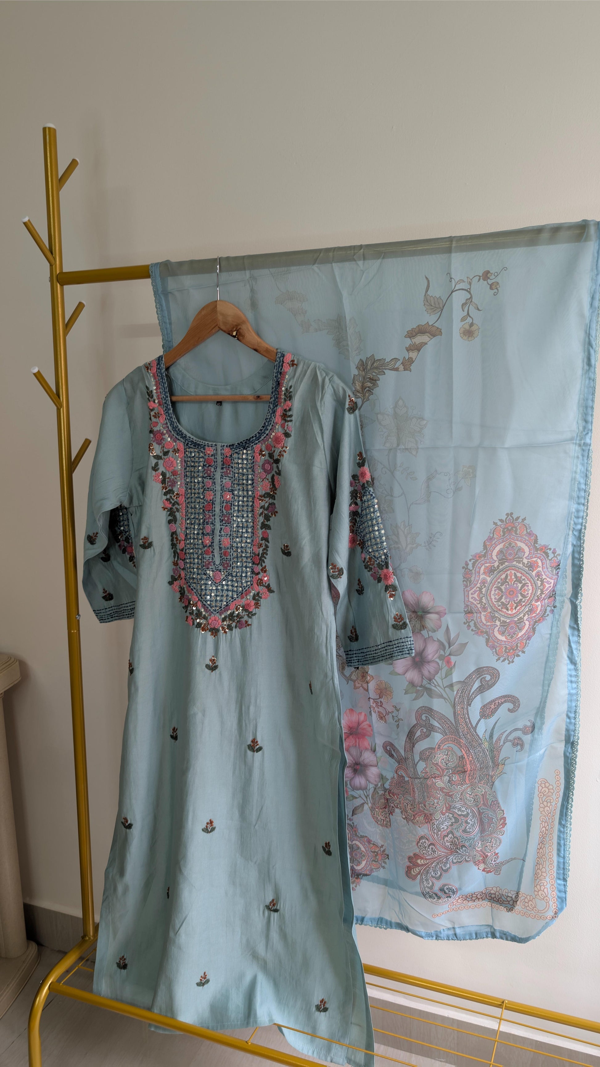 Grace your festive and semi-party occasions with this beautifully detailed 3-piece suit set. Designed with intricate thread and mirror embroidery on the kurti and sleeves, this outfit blends traditional charm with modern flair.