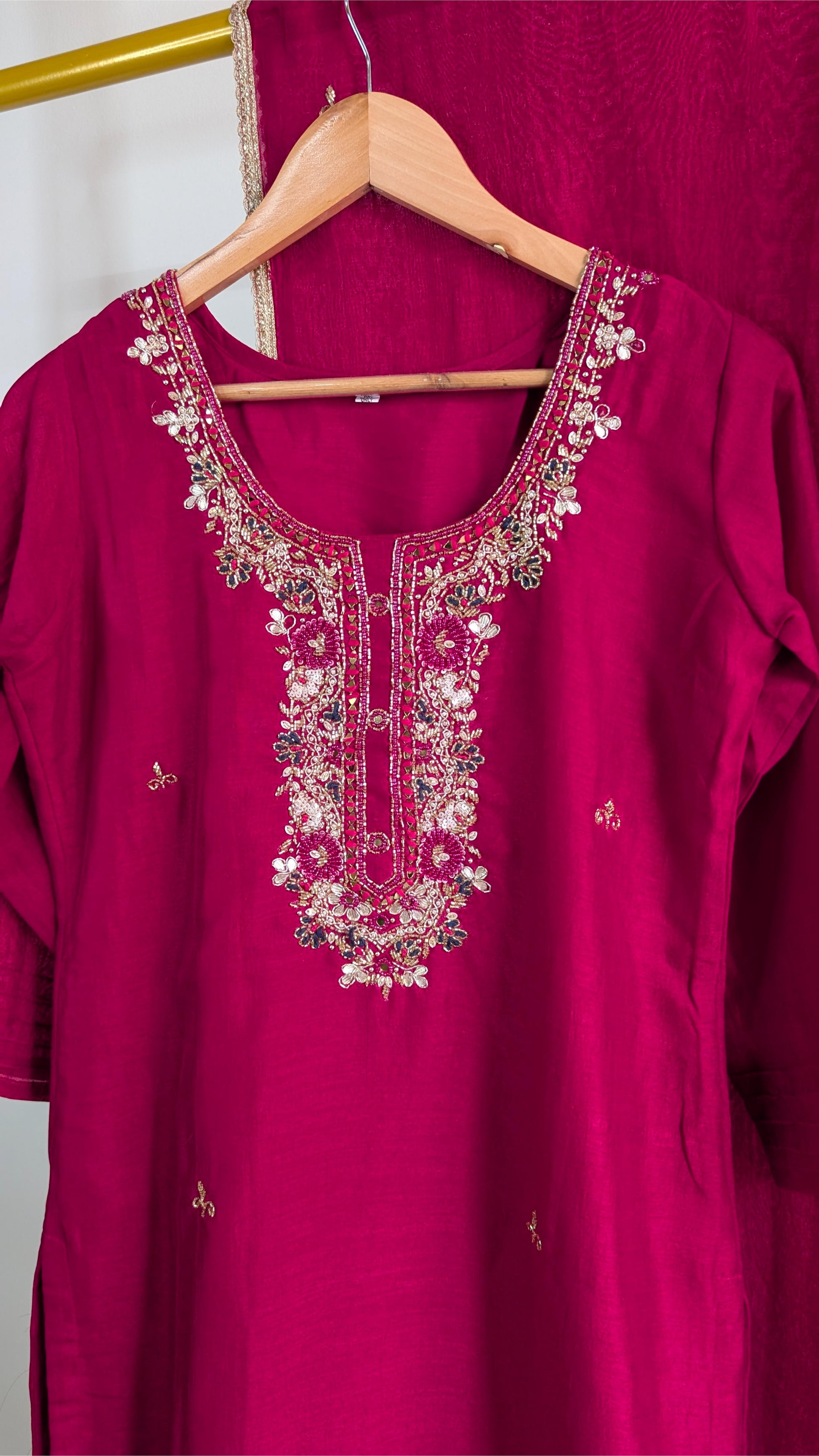 Add a touch of grace to your wardrobe with this stunning magenta 3-piece kurti set. Crafted from soft fabric, it features intricate hand embroidery with zari and thread work on the neckline and front panel. Perfect for festive occasions, parties, and traditional gatherings, this elegant kurti set combines timeless style with modern comfort. Pair it with matching accessories for a complete ethnic look.