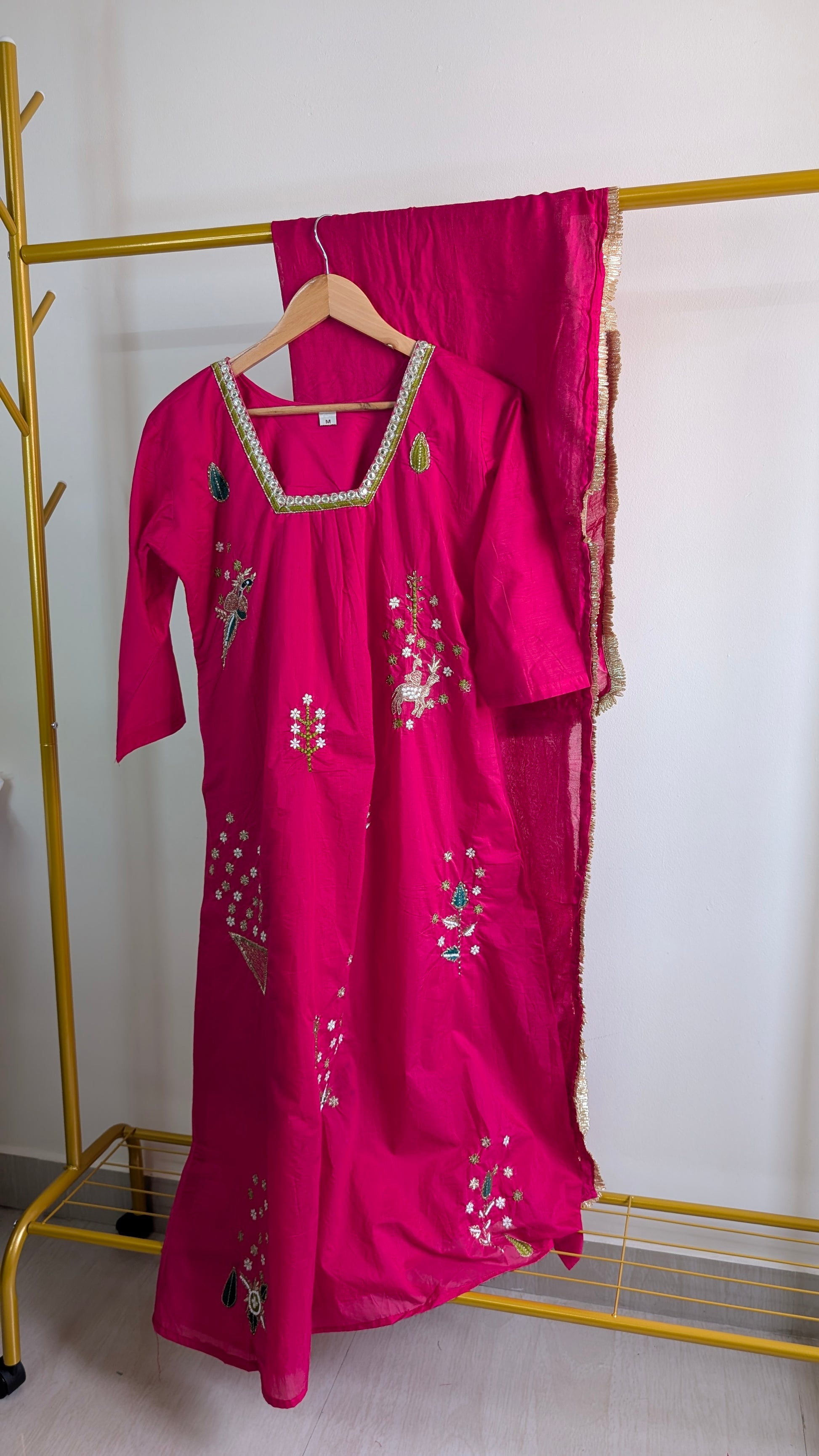 Add a touch of elegance to your wardrobe with this stunning Mul Chanderi 3-piece set. Featuring delicate floral and bird embroidery, this set comes in vibrant pink, yellow, and rust colors, making it perfect for festive occasions or traditional events. The set includes a beautifully crafted kurta with intricate detailing, a matching dupatta, and is designed to offer both comfort and style. Elevate your festive look with this timeless piece!