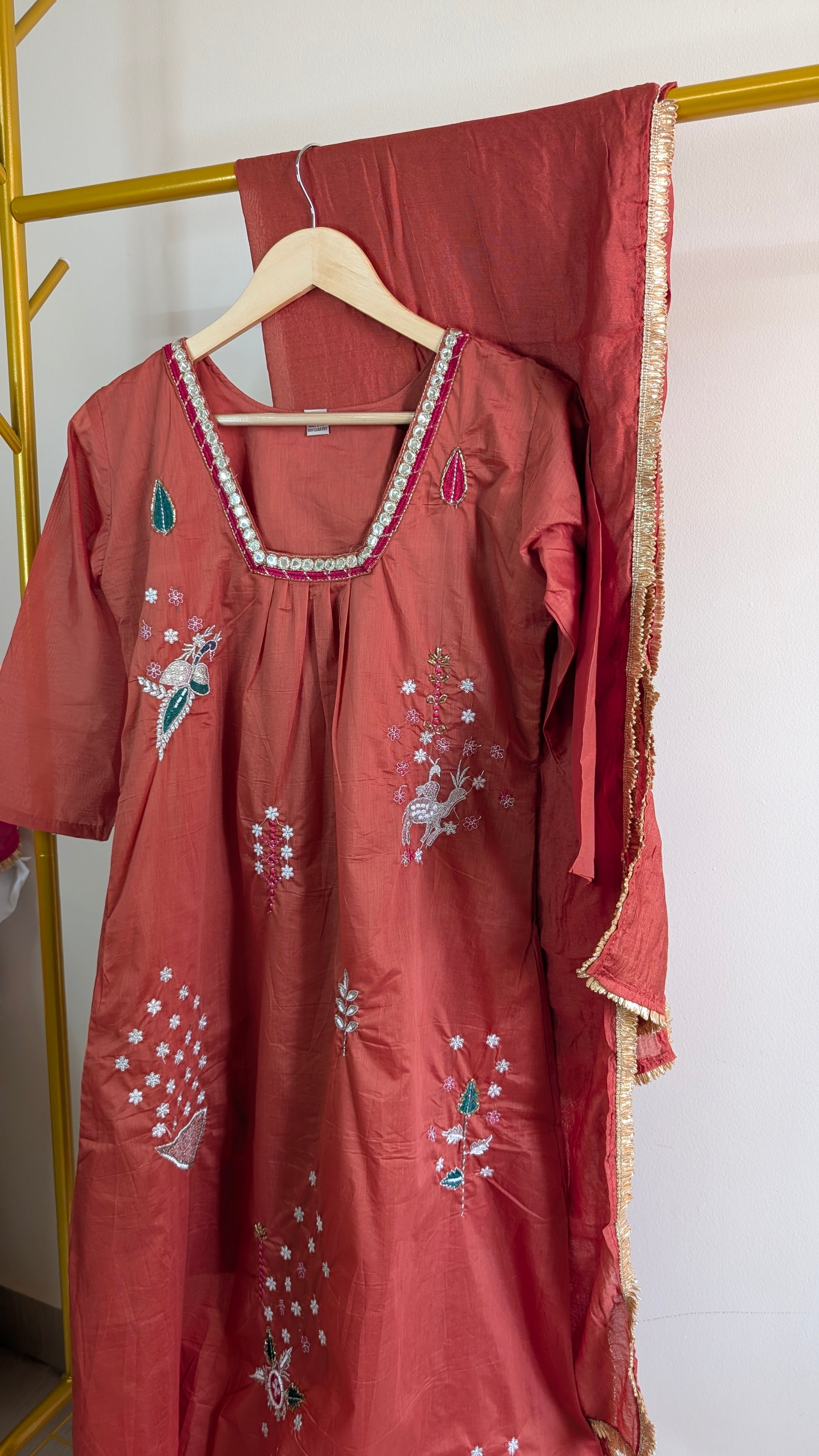 Elegant Mul Chanderi 3-Piece Set – Intricate Embroidered Kurta & Dupatta (AC00045)