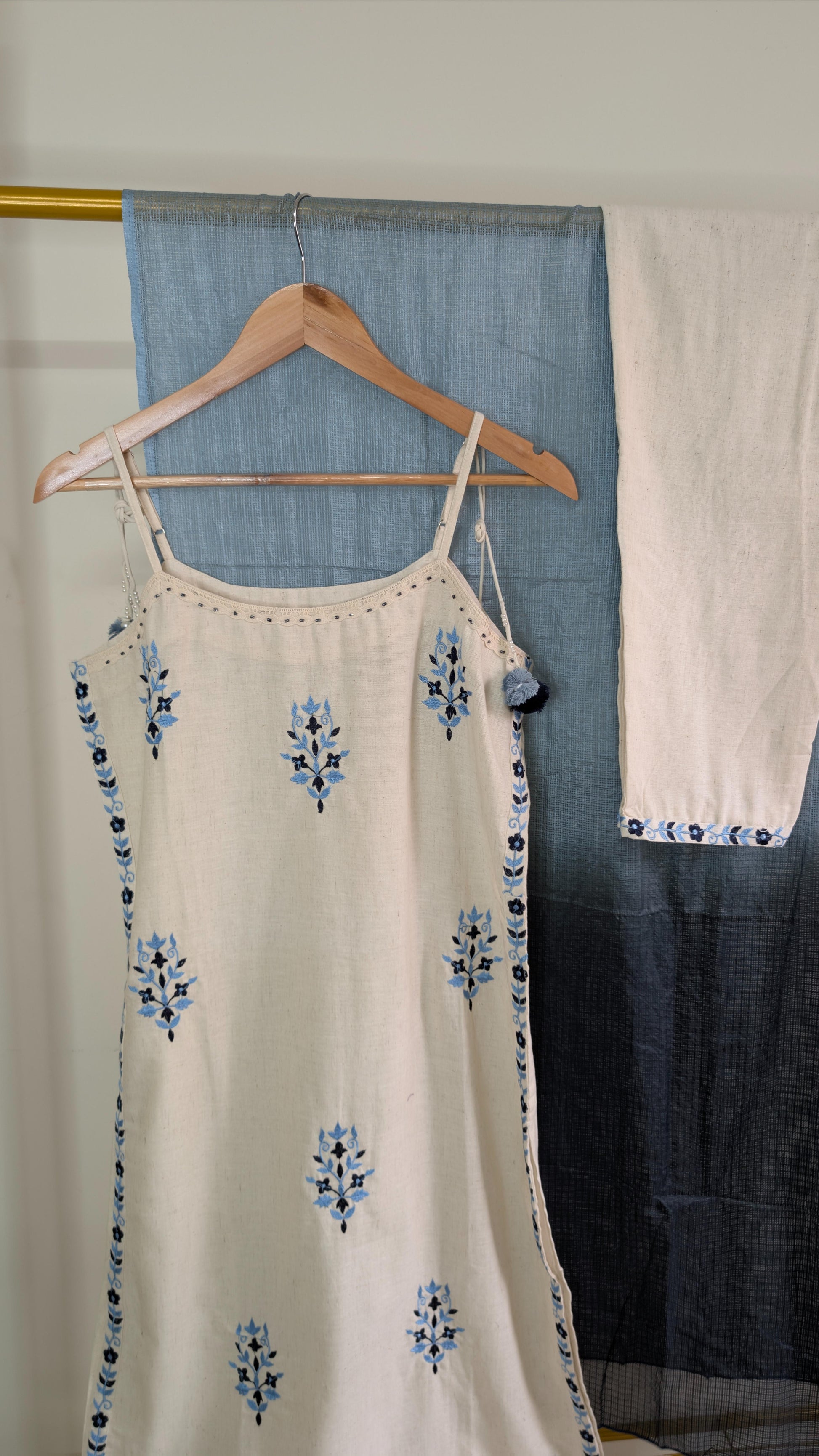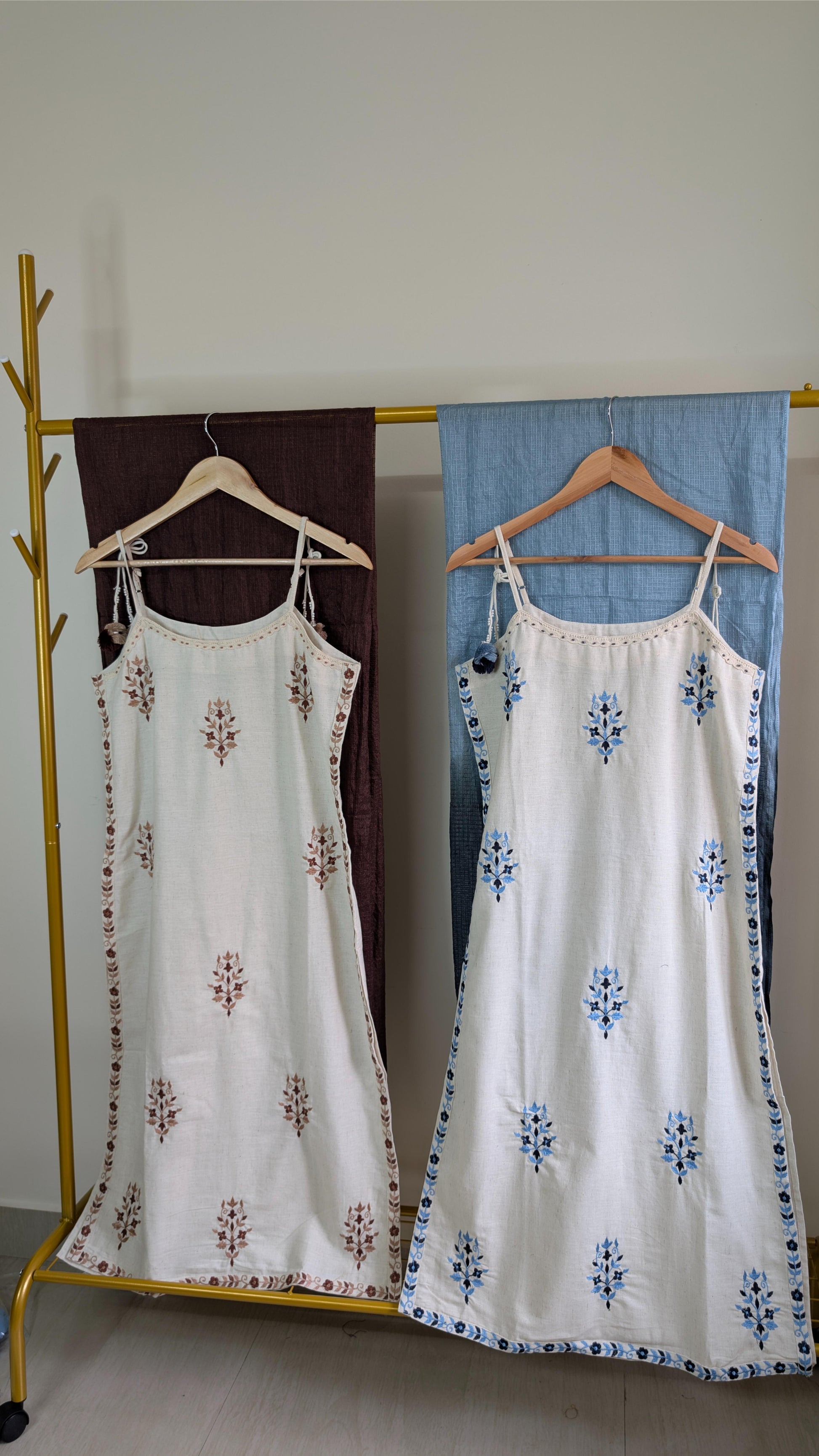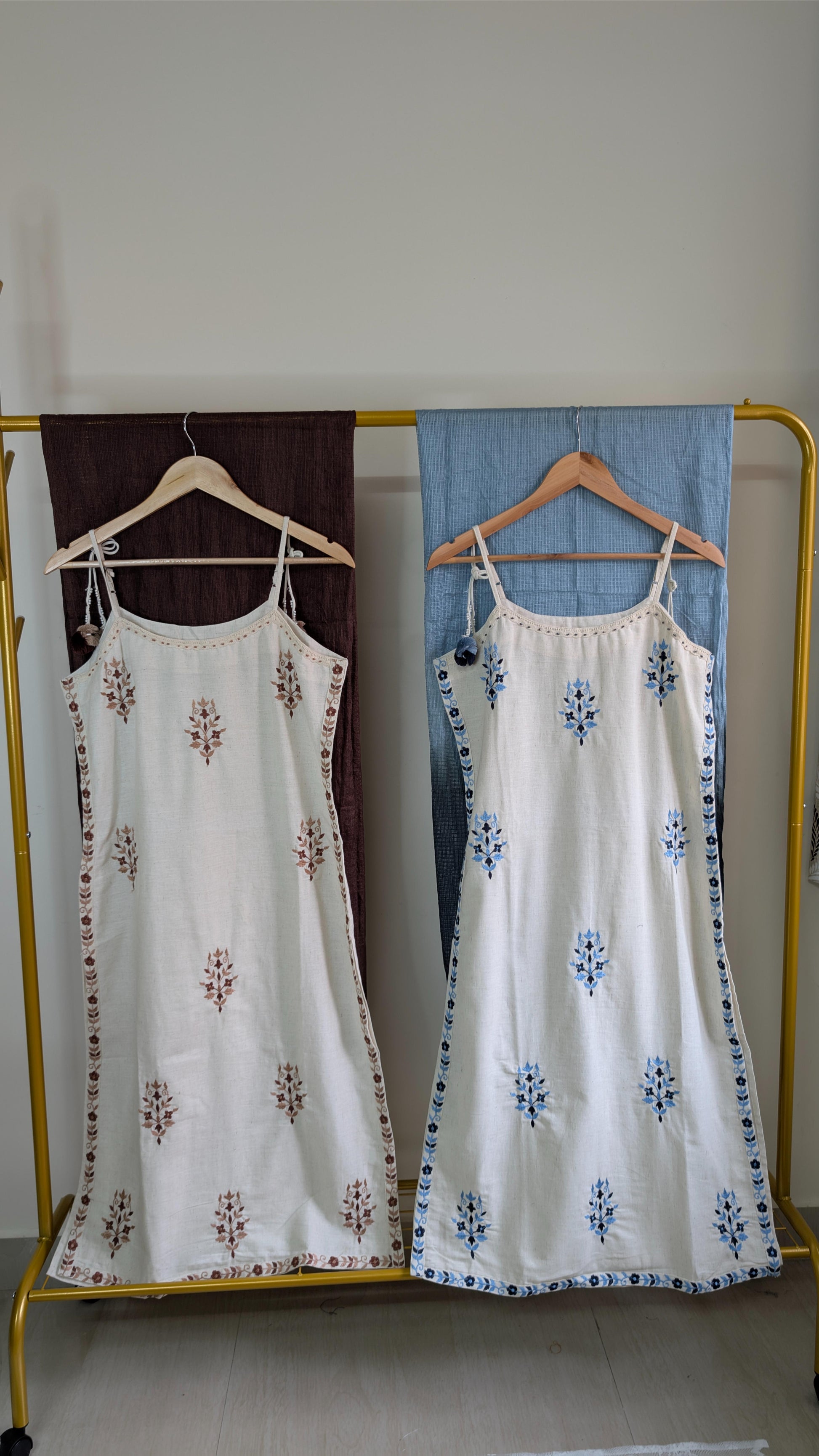 Step into effortless elegance with these Handcrafted Sleeveless Cotton Dresses, beautifully adorned with traditional floral embroidery in earthy brown and cool blue tones. Designed with delicate tie-up shoulder straps and a relaxed fit, each dress is paired with a complementing cotton dupatta, creating a perfect balance of boho chic and ethnic charm. Ideal for summer days, vacations, or casual outings, these breathable and stylish outfits are a must-have for lovers of artisanal fashion.
