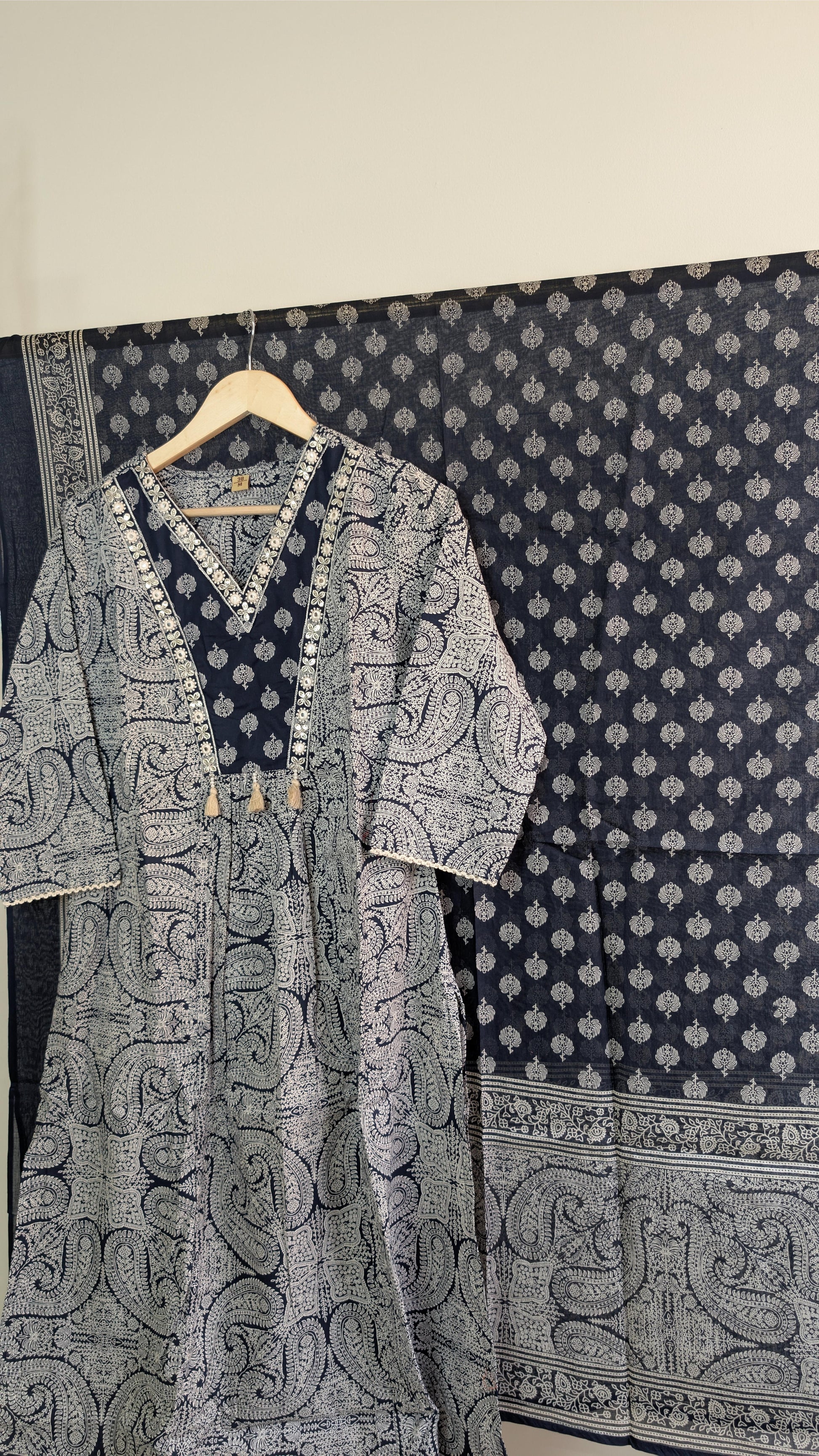 Indigo Handblock Cotton Kurti Set with Mirror Work & Tassels – Timeless Elegance (AC00013)