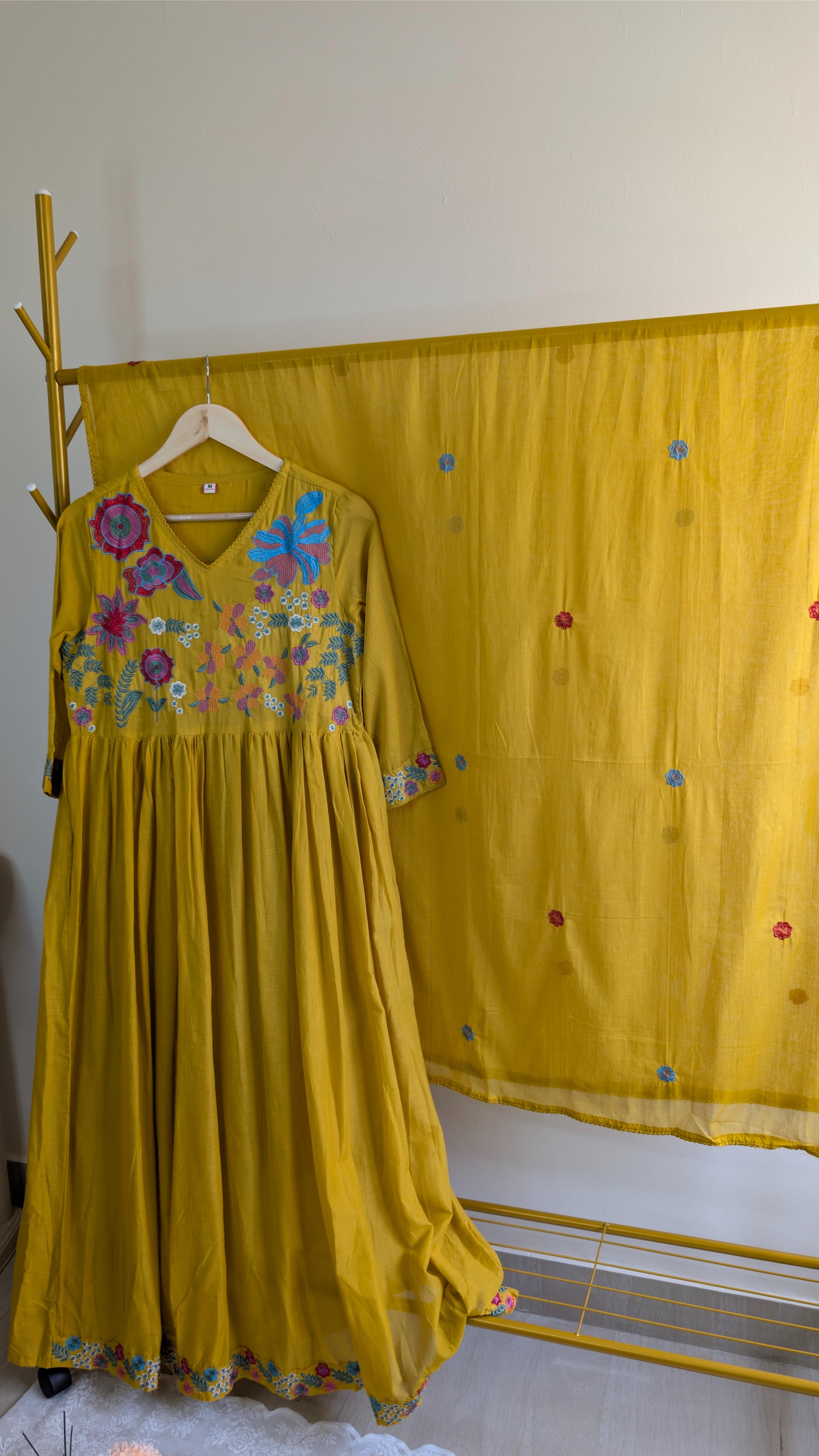Step into effortless elegance with this beautiful mustard mul cotton 3-piece kurti set, featuring a stylish frock-style kurta adorned with delicate floral thread embroidery on the yoke. Crafted from airy, breathable mul cotton, this set offers ultimate comfort with a graceful flare — perfect for festive brunches, office wear, and casual ethnic outings.