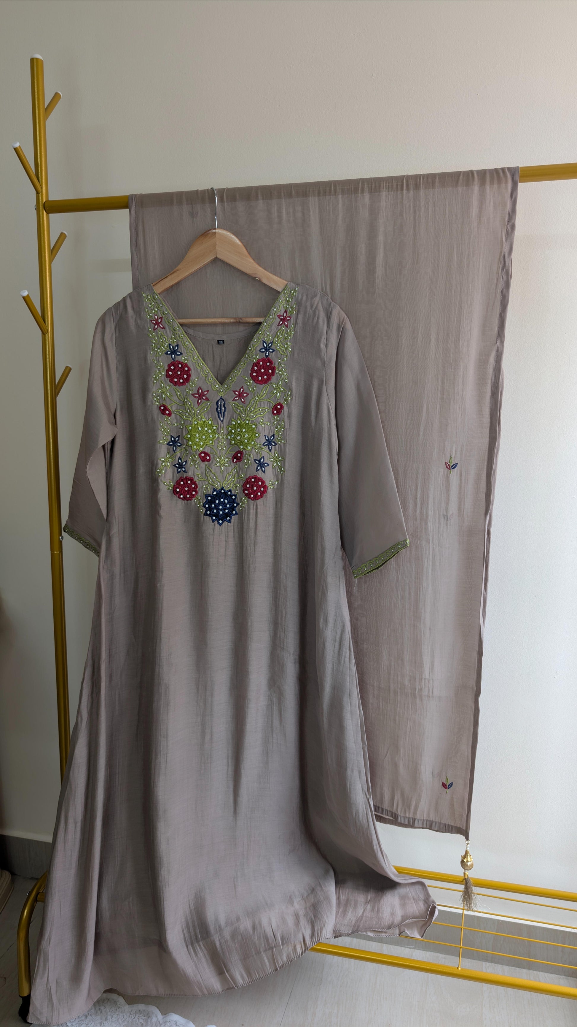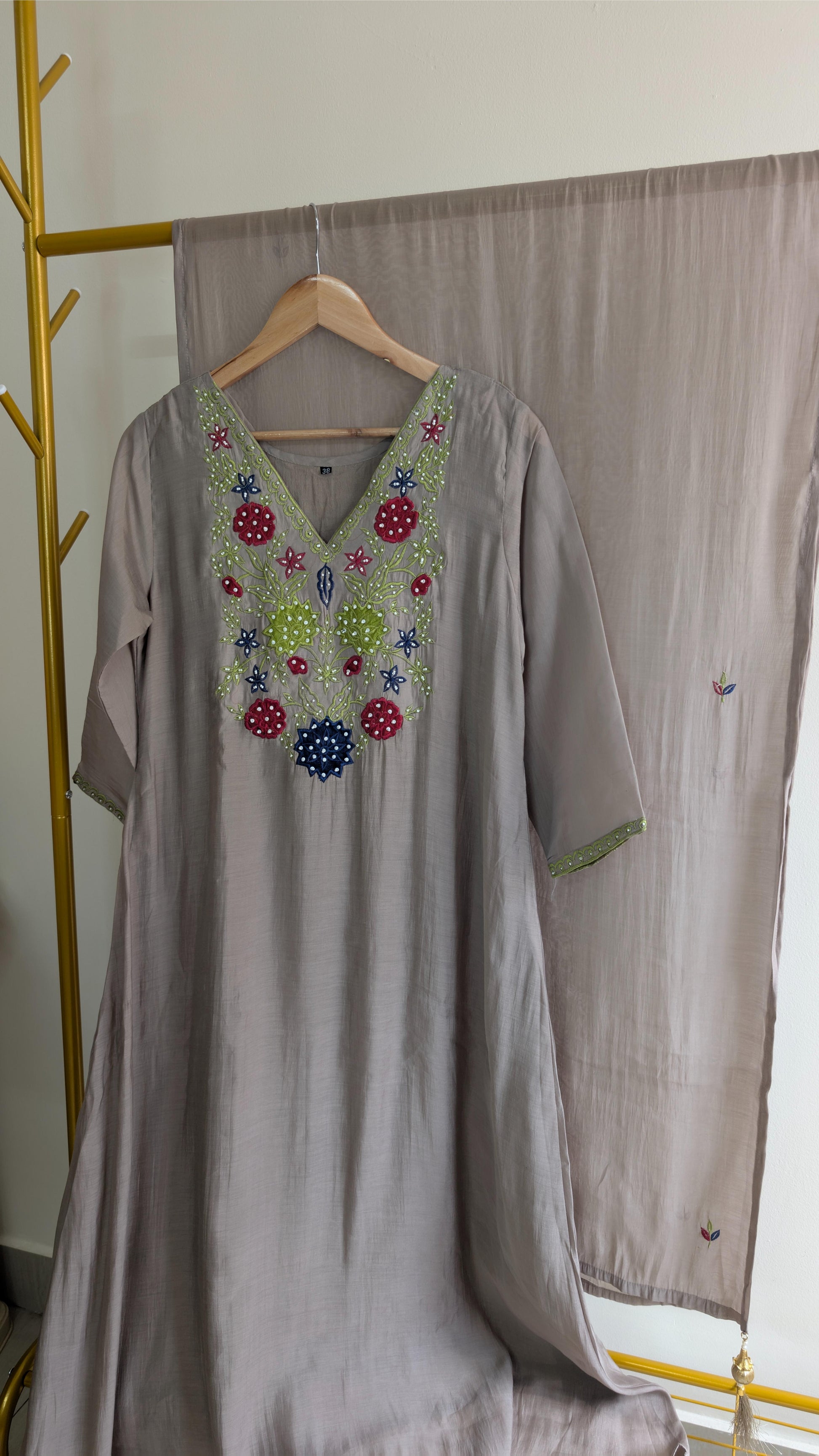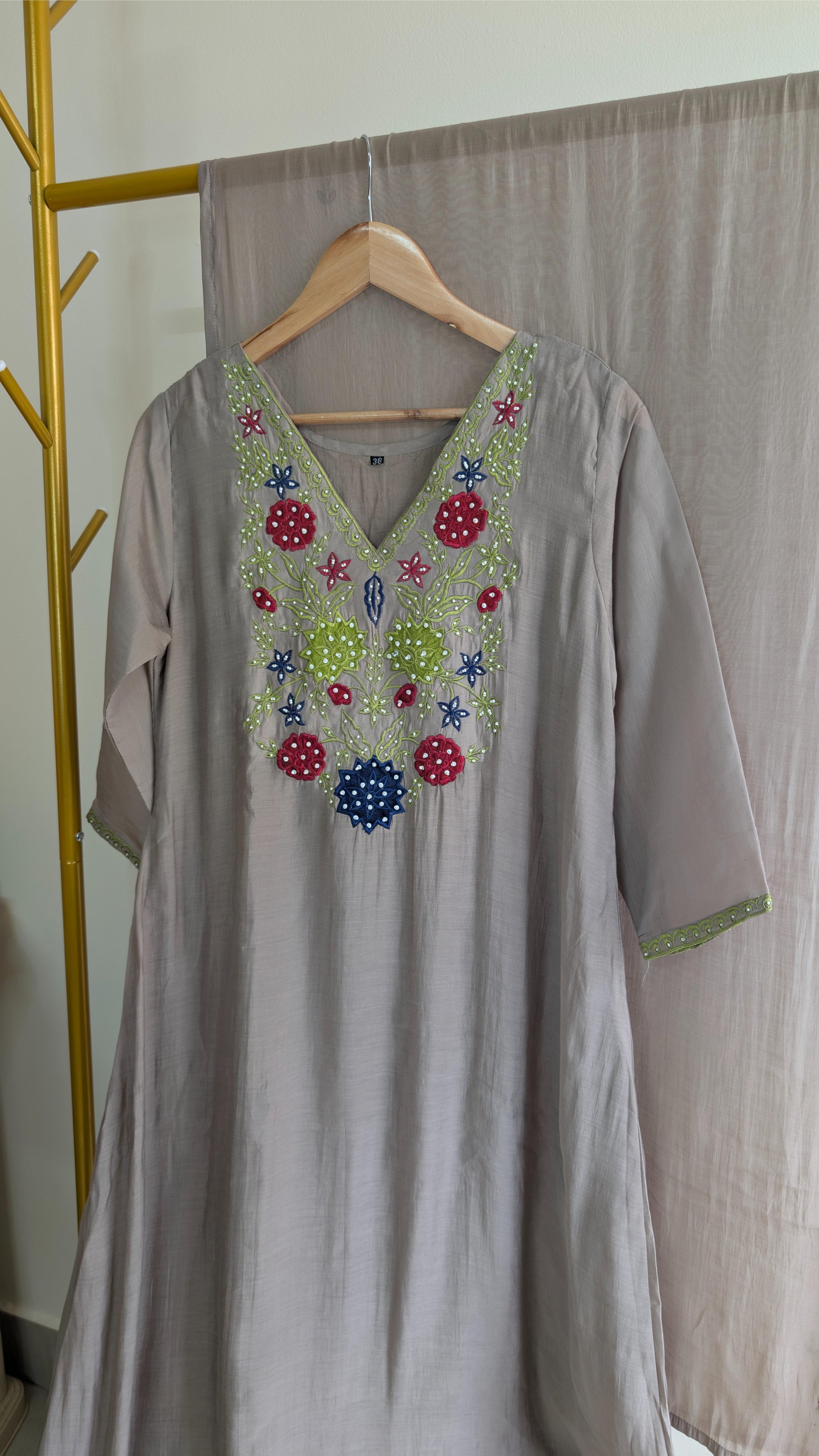 Premium Grey Mul Chanderi Suit Set | Embroidered Kurti with Dupatta (AC00024)