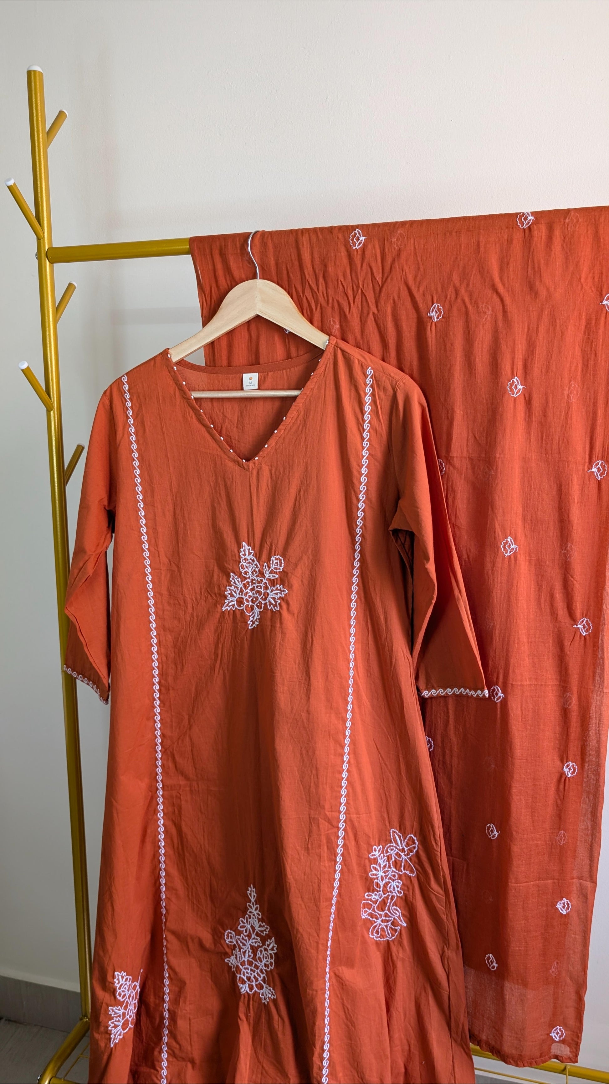 Upgrade your ethnic wardrobe with this elegant 3-piece mul cotton kurti set for women, available in vibrant orange and deep purple shades. Crafted from ultra-soft, breathable mul cotton, each set includes a beautifully embroidered kurti, matching bottoms, and a coordinating dupatta. The intricate white thread embroidery adds a touch of sophistication, making it perfect for casual wear, office attire, or festive occasions. Designed for all-day comfort with a stylish V-neck and relaxed fit.