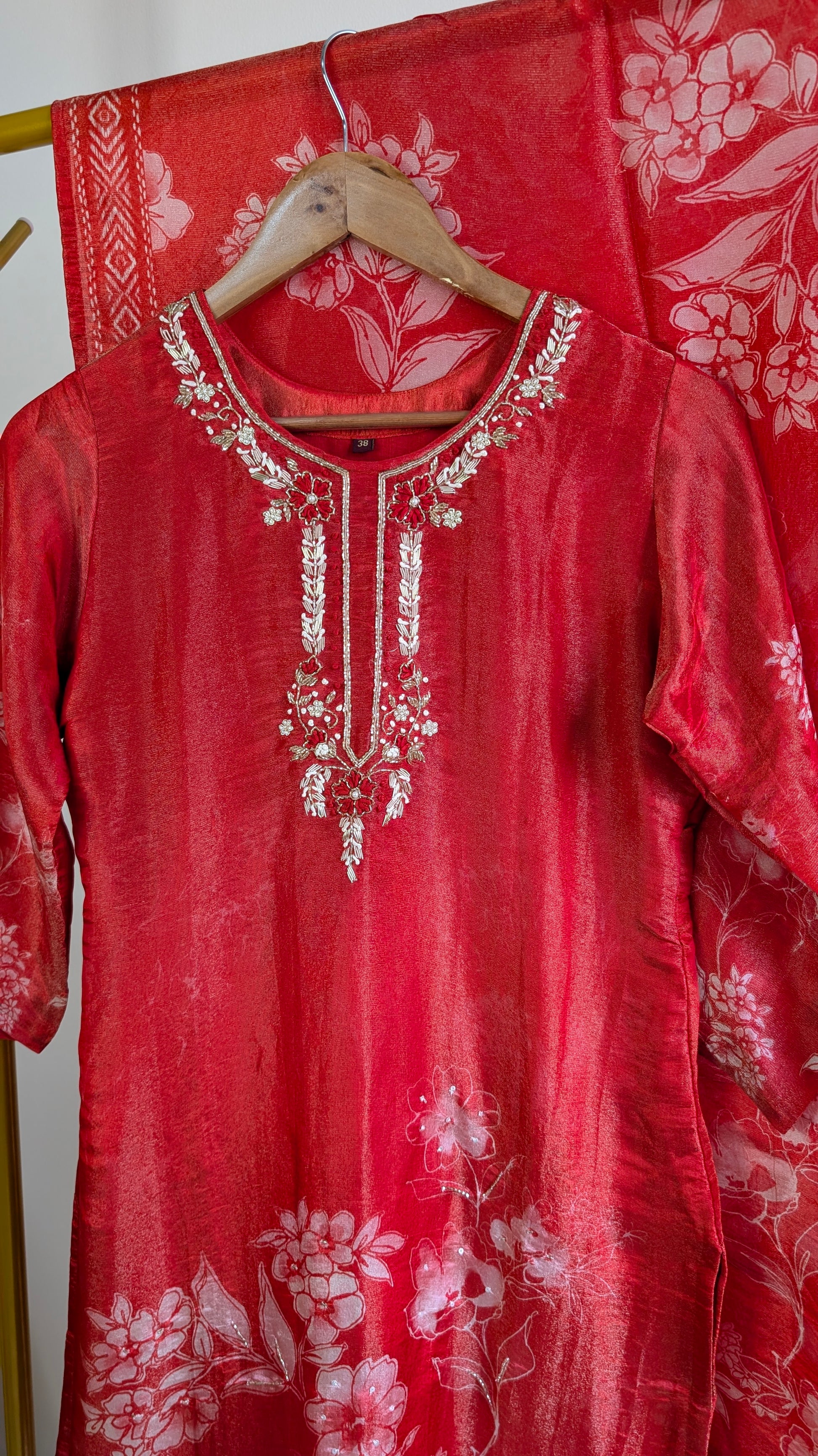 Elevate your ethnic wardrobe with our luxurious Pure Tissue Fabric Kurti Sets, featuring delicate hand embroidery and intricate floral detailing. Available in stunning shades of rust orange and deep red, each piece is paired with a matching dupatta to create a timeless festive look. Perfect for weddings, celebrations, and party wear, this elegant ensemble combines traditional craftsmanship with modern charm.