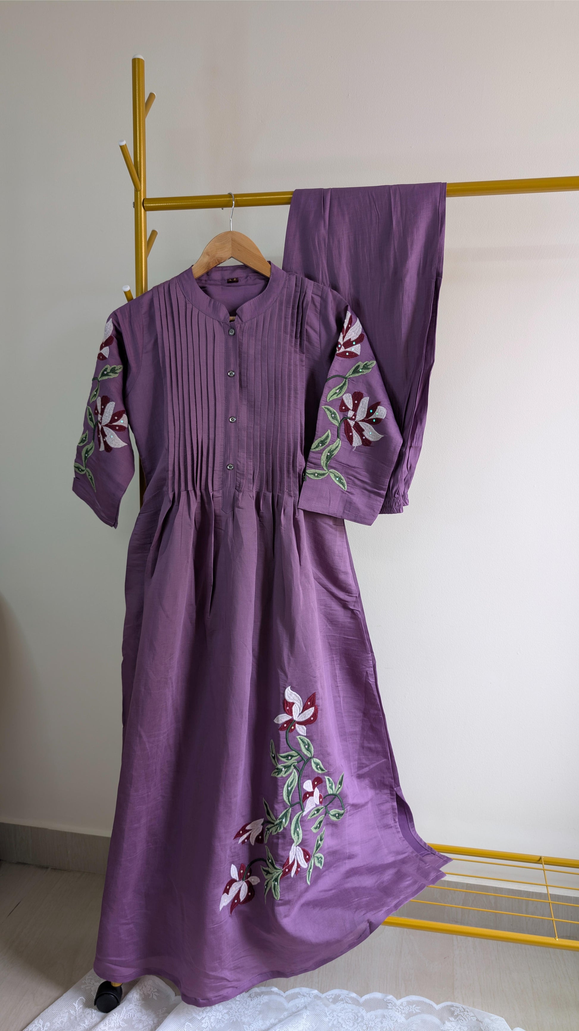 Purple Cotton Kurti Set with Floral Embroidered Sleeves (AC00021-2)